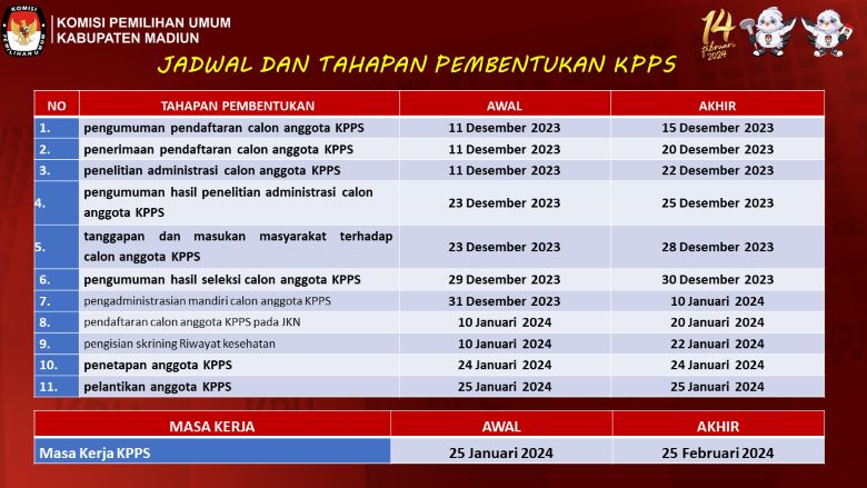 Dalam rangka pembentukan Calon Anggota Kelompok Penyelenggara Pemungutan Suara untuk Pemilihan Umum, Komisi Pemilihan Umum Kabupaten Madiun mengundang Warga Negara Indonesia yang memenuhi kualifikasi untuk mendaftarkan diri menjadi anggota Kelompok Penyelenggara Pemungutan Suara untuk Pemilihan Umum dengan ketentuan sebagai berikut :