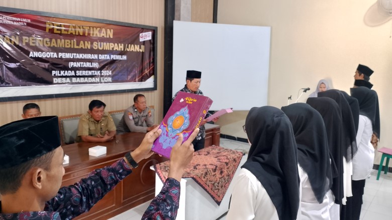 Babadan Lor - Panitia Pemungutan Suara (PPS) Desa Babadan Lor Kecamatan Balerejo Kabupaten Madiun melantik dan mengambil sumpah 8 (delapan) orang petugas Pantarlih Pilkada 2024 pada hari Senin, 24 Juni 2024. Pelantikan dimulai pukul 09.00 WIB bertempat di Ruang Pertemuan Kantor desa Babadan Lor dan dihadiri oleh 8 (delapan) petugas Pantarlih terpilih, sekretariat PPS, Panwas Desa, Bhabimkantibmas dan Babinsa Desa serta Kepala Desa Babadan Lor.