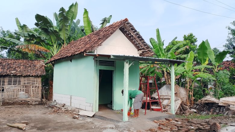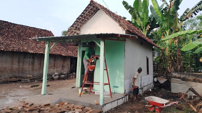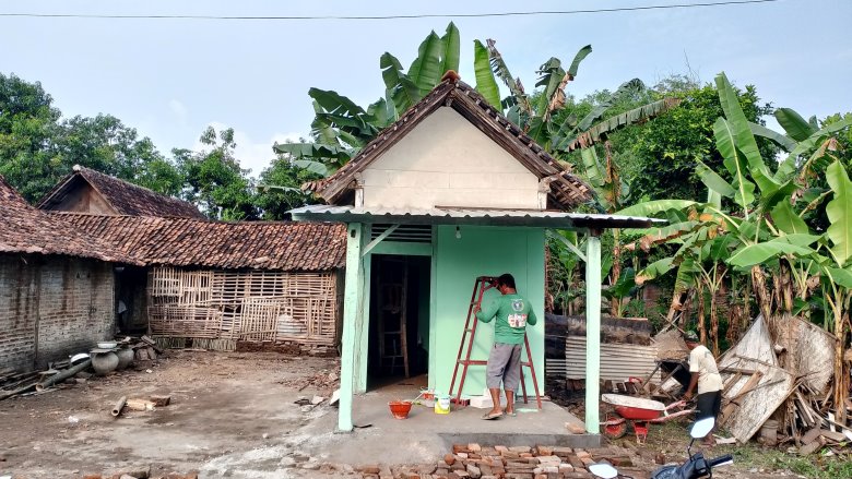 Dalam waktu beberapa hari, rumah Mbah Sinem pun mengalami perubahan signifikan. Dari sebelumnya hanya berdinding anyaman bambu dan lantai tanah, kini berdiri rumah sederhana tapi kokoh, lengkap dengan dinding bata ringan dan kasibot, atap yang layak, lantai semen dan ventilasi yang memadai.